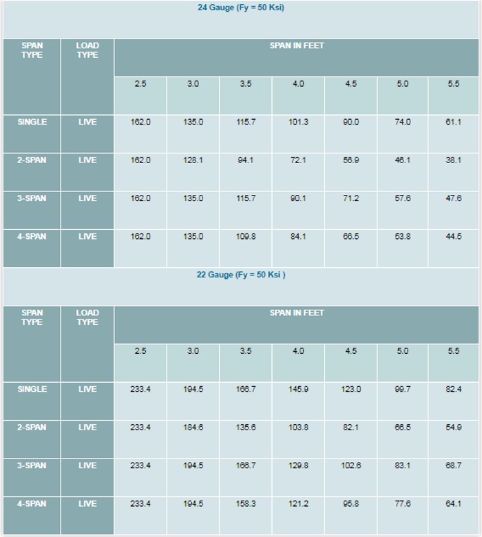 - Allowable loads are based on uniform span lengths and Fy = 50 ksi.